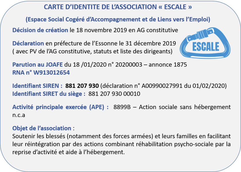Ainsi, après avoir participé au groupe d’étude initial de l’armée de Terre, le général (2S) Vincent LEROI avec quelques blessés et amis, créent l’association ESCALE le 18 novembre 2019 et la déclarent le 31/12/2019 à la préfecture de l’Essonne. Elle est publiée au JOAFE n° 20200003 le 18 janvier 2020 sous l’annonce n° 1875.